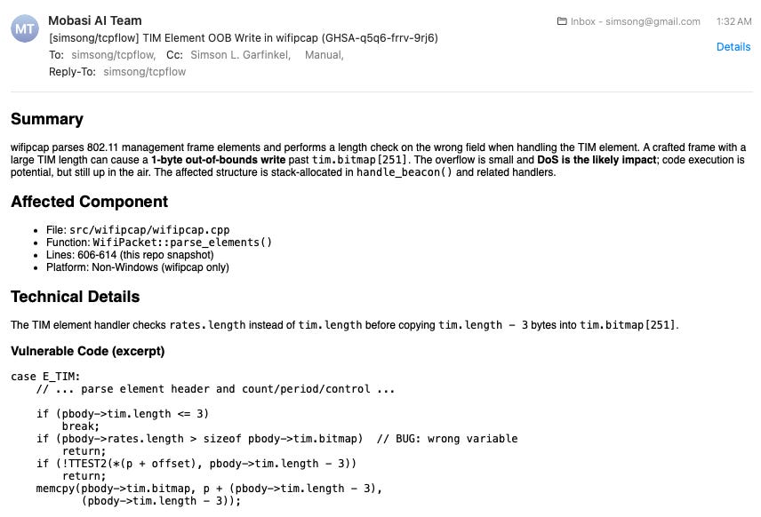 For those of you who don’t speak the language of security vulnerabilities and C++, what’s happened here is that the Mobasi AI Team found a security vulnerability in my program and has provided me (and the world) with an exploit that demonstrates the vulnerability. Right now, the exploit only causes my program to perform an illegal memory operation, something it can typically recover from. However, this exploit can likely be crafted into a remote code execution (RCE) exploit. That is, a motivated attacker could probably create a special file or disk image that, when analyzed with my digital forensics tool, would run code on the computer running my program as if that code were entered and run by the tool’s operator.