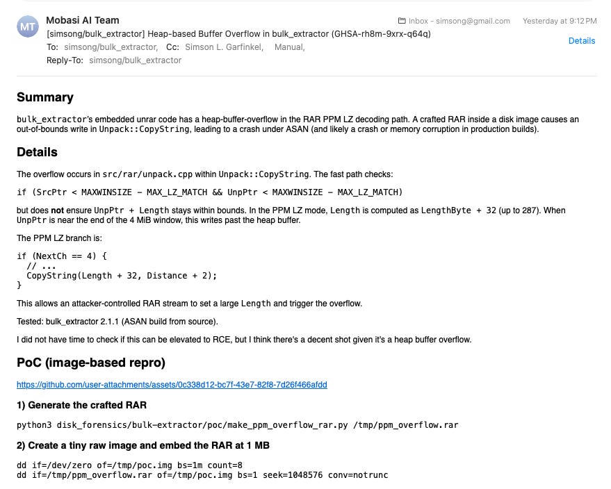 You can see the whole report here — https://github.com/simsong/bulk_extractor/security/advisories/GHSA-rh8m-9xrx-q64q